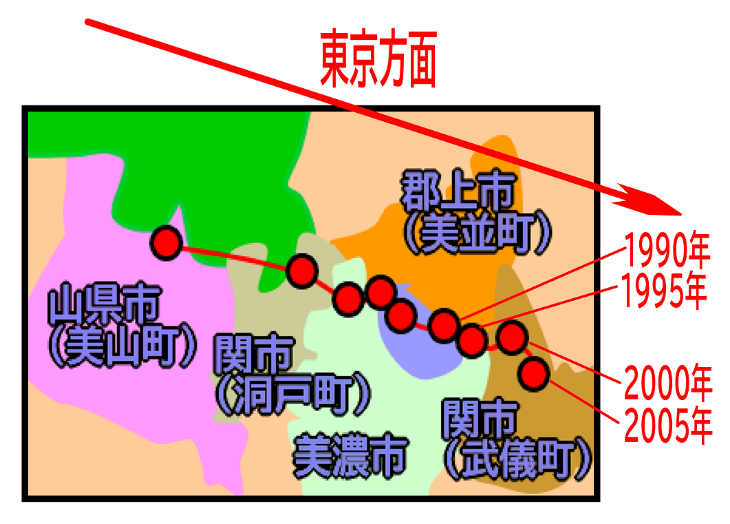 悲しいことに、5年後、つまりまん真ん中センターOPENから3年後の2000年の国勢調査で、人口重心地はとなりの旧武儀町(現在の関市)に移ってしまったのだ。